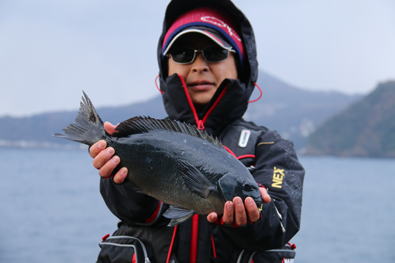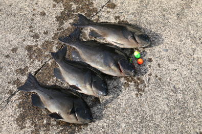 達也君は水道から出る潮と左沖から来る潮がぶつかる潮目の場所を攻めて40pを2尾、41pを1尾、35〜40p未満もかなり釣った。今回は餌取りもいないように思われ、コッパメジナもいないようだが、達也君は海上の餌取り「かもめ」がヒットし苦労した。