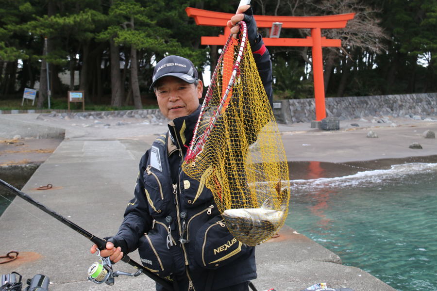 メジナもノッコミ期に入ったと思われ、岡田進さんと昨年この時期に、西伊豆・井田でメジナの爆釣を経験したので、「あの夢をもう一度」と思い、前日船長にTELを入れ予約。 3月19日(月)岡田さんと共に到着すると南西の風が強く波もあり渡船不可能。このような事は3回目で、普段の行いが余程・・・(笑い)。そこで、前回、前々回は石廊崎まで移動したが1時間30分以上の移動はうんざり!・・・そこで、風の影響も少ない「戸田・御浜岬の堤防」に移動した。 ここは御浜岬の先端近くで戸田港に面し「諸口神社」の赤鳥居の前に30m程の小さな堤防がある。岡田さんはこの釣場は30年ほど前に頻繁にクロダイ狙いで通った場所で、メジナ・マダイも釣れるとのことで久しぶり。早速、準備に入り岡田氏はメジナ狙いで堤防先端の右側に、自分はクロダイ狙いで左側に入った。潮は左から右へ戸田港方面に流れている。 開始から30分ほどで岡田さんの「硬調黒鯛1号」の竿が大きく曲がり釣り上げたのは、40pジャストのメジナ!・・・ちなみにクロダイ竿だが岡田さんは伊豆半島のメジナはこの竿で通している。理由はクロダイ竿の方が暴れないので取り込みが楽とのことでクロダイ狙いの場合は「硬調黒鯛0.6号」だ。 久しぶりの40pに笑みがこぼれる。しかし、その後全く魚信が途絶えてしまった。自分は、最初はタナ、4ヒロ程で行っていたが、3ヒロにタナを上げたら、33p程のクロダイを釣り、更にしばらくすると同程度のクロダイを釣った。いずれも、ノッコミに入ったクロダイでお腹が膨らんでいた。その後、暫く魚信が途絶え、足下は3〜4m程の水深で、見ると時々クロダイが「ヒラを打ち」横縞模様の30〜35p程度のクロダイが数尾見え、その後10尾以上のクロダイが見え始め群れで入ってきたと思われる。 コマセを撒くと反応するがタナを2ヒロ程にしたが付餌には反応せず釣れなかった。やがて潮が止まりタナを3ヒロに戻し10m程先に投げ仕掛けが馴染むと「チヌキラー(S)G3」のウキがジワジワと入り、アワわせると、強烈な引きと心地よい重みを感じ、浮かせてタモに取込み計測すると47pの立派なクロダイ・・・満足。その後、錬り餌(食い渋りイエロー)に替えたら、ウキが同じように入り込んだので合わせたが、残念ながらスッポ抜け・・・技量不足と深く反省。 岡田さんに「真上にアワせるからハリに乗らないんだよ、水面と平行にアワせないとスッポ抜けが多くなるよ」と良く言われるが私は真上にアワせてしまうクセがあり、またもや”反省” 岡田さんは・・・ 「アタってるよ!」と言う前に軽く引き戻すようなアワせでクロダイを掛け・・・ 「ミチイトでアタリが取れた、アハハ・・・」と笑いながら取り込む。 私のスッポ抜けや素バリを引くことが多いのは、この辺にあるようだ。 この釣場は、駐車場からも比較的近く、土・日は朝早く(暗い時間帯)から夜釣り等のカゴ釣り・ルアー等の釣り人が入るため平日がお勧めかも。 チームウキ工房・北村 則康 |