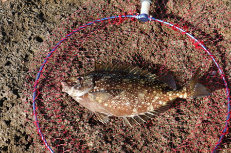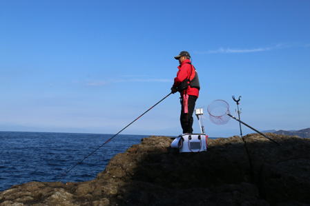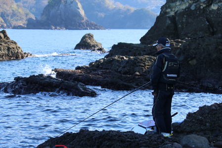 | 「今回は大型ではムコ殿にやられた!!!」・・・でも43cmに満足! | 雄島向きの先端で時々足元を濡らしながらも前半は絶好調で頻繁に竿を曲げた |