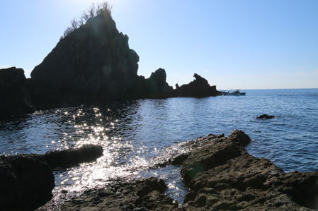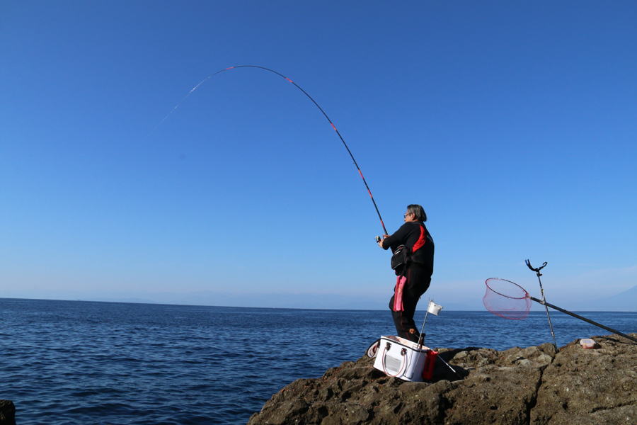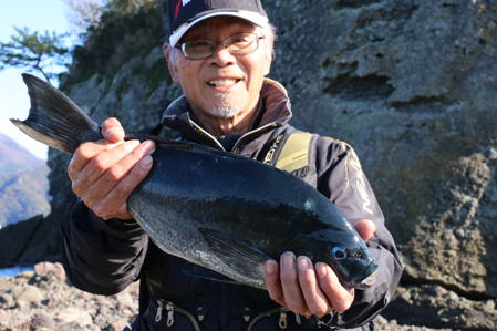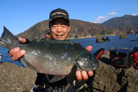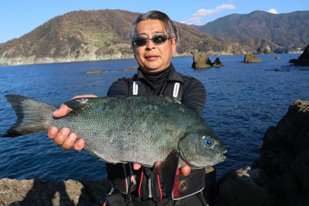 西伊豆・田子雌島で秋磯満喫! 夜明けが遅くなり午前6時頃出船。「雌島」の西カドに位置する「青根」に渡礁。ここ「青根」は、岡田さんは以前来たことがあり、極めて足場が良い釣り場と言うことで、老々介護釣り師にはうってつけの釣り場らした。 岡田さんは、キタマクラとアイゴの猛攻に遭い苦戦するも、10時の潮変わりを待たずにしっかり43pのメジナをゲットし、その後も40pオーバーを釣り上げていた。 |