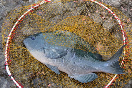 | 10時の干潮までは苦戦していたが上げ潮に入りちょっとだけ上り潮が動いたとたんに 45cmの良型を取り込み終わって見れば40cmアップ4尾と好調! |