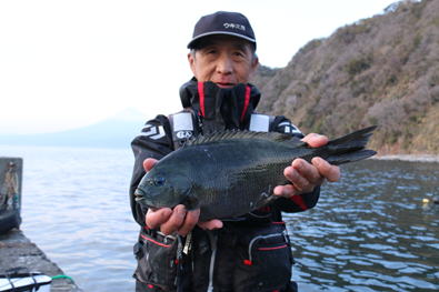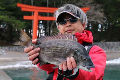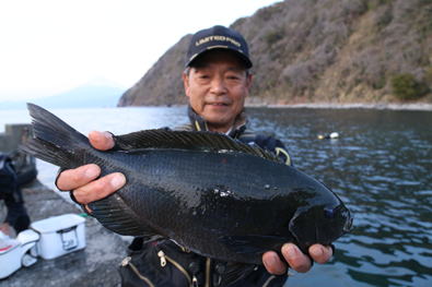 この日、角田さんは三の島の北向きに釣り座を構え、岡田さんは地方側で同じ北向きを狙っていたが、角田さんは広範囲を狙って30cm前後から41.5cmまでを20尾ほど上げていたが、岡田さんは30cm前後の小型1尾と41.5cm、40cmジャストの計3尾だけ!?・・・ まさに省エネ釣法だ。自分は上り潮になったので、富士山向きに釣座を変更し35p前後を数尾釣ったがスズメダイの猛攻に撃沈。港に戻り計測すると、どういうわけか3人とも見事に同長寸441.5pのメジナ。その他38〜40pを数尾持ち帰った。