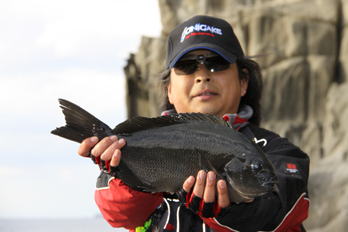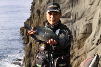 セオリーどおり磯際を攻めてみるが反応が無く、タナを3.5ヒロまで深くしてみたが、エサ取りによるものと思われる当りのみ。そこで、以前竿を出した時35p程度のメジナを釣ったことのある、沖よりの場所を攻めることにし、ウキを同じフィールドプラスSSから「S・浮力0」に変更し、ガン玉をハリスに5・6・7と段打ちし、更に針を5号に落とし小さいオキアミを付け餌にしタナ2.5ヒロで釣座30〜40m先にある海面より顔を出している岩礁手前当りに遠投し沈め気味にミチイトを張っていると、穂先に「コツコツ」と言う当りを感じ、その後穂先をジワ―っと持って行き、軽く合わせるとグーンと快い引きを感じ寄せてタモに収めると33p強のメジナ。