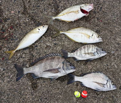 | ●天候・潮・水温 10.7 晴れ・中潮・21℃ 10.14 曇り時々雨・中潮・21℃ 10.15 晴れ・小潮・20 ●日時 2018.10.7(日)・10.14(日)・10.15(月) ●釣り場 茨城県磯崎一文字堤防 ●釣り方 ウキフカセ釣り ●釣果 10.7 クロダイ25〜28cm6枚・アジ25〜30cm9匹 10.14 クロダイ30cm前後3枚・メジナ25cm前後2枚・シマダイ25cm1枚・アジ25cm2匹・シマアジ25cm1匹 10.15 クロダイ22〜31cm3枚・シマアジ25cm前後2枚・アジ25cm1匹 ●使用したウキ おかだどんぐりPRO-R(LL)1号 オレンジ キャッチ(L)B イエロー クリアー凸(L)0〜G3 イエロー クリアー凸(L)5B イエロー ●コメント 10月7日(日) この日は台風の影響で全国的に悪天候に見舞われ、当初参加予定していたマルキユーMFG大会も中止になり地元での釣りもできないかと諦めていましたが、台風が少し日本海側にそれてくれたおかげで太平洋側の茨城県はどうにか釣りができる天候になり釣行することができました。 釣り場は阿字ヶ浦と磯崎港の間にあり砂浜から伸びている「磯崎一文字堤防」に私の師匠であり、ウキ工房フィールドテスター 伊藤 武さんと釣りへ出掛けました! 後から私の後輩でウキ工房茨城支部の田中 佑紀くんが合流予定です。 釣り場は磯崎港側と阿字ヶ浦側があり、どちらも良い釣果が期待できる釣り場です! この日は釣り人が多く、風などの影響も考え、堤防の中間ぐらいの磯崎港側に最初入りました。 足元には基礎石が斜めに入っており、5mぐらい先から深くなっていてキワ狙いでもさらに先の遠投でもクロダイの釣果は期待できます。 「クリアー凸(L)5B イエロー」をセット、エサ取りの多さを考え遠投から攻めて行きます。 午前中は特に変化もなく、コマセを撒くとエサ取りの大群に囲まれてしまい、付けエサを通しにくい状況が続きます。 阿字ヶ浦側へ場所を移動した師匠 伊藤 武さんが「アルミエンスイ(L)G3 オレンジ」を使用して沈黙を破りファーストヒットを引き出します!! 釣れてきたのは茨城県ではとても貴重な尺アジです♪ そこから連続ヒットで尺アジが爆釣! ヒットが止まりません!!! 私も場所を移り、「クリアー凸(L)G3 イエロー」にすかさずチェンジして、アジをヒットさせます! 私と一緒に場所を移動した田中 佑紀くんもアジに引き続き、クロダイを6連続ヒットさせ本日の竿頭で納竿にいたしました。 10月14日(日) 私の所属するウキ工房茨城支部の例会が予定されていましたが前日の予報が急に変わってしまい、午前中の雨と北東の風が吹く予報により安全を計り中止となりました。 そんなこんなで先週に引き続き師匠の伊藤 武さんと磯崎一文字堤防で竿を出すことにしました。 なんだかんだタフコンディションに強い堤防なので、良く釣行します! 地元の方もたくさん釣りに来ていて、秋になると釣果が期待できるので人気な堤防です。 今回は堤防の先端が空いていたので先端へ入らせていただきました。 先端はいつも潮通しがよく、水深もありなかなか面白い釣り場です。 私は先端の阿字ヶ浦側で竿を出すことになり、先端方向に流れが複雑に入るところだったのでしっかりタナを意識して「おかだどんぐりPRO-R(LL)1号 オレンジ」を選択しました。 潮のぶつかるあたりにうまくウキが入り、ファーストヒットは私が手のひらサイズのメジナを釣り上げ、その後は夕方にかけ先端で釣りをしていた師匠の伊藤 武さんが「キャッチ」を使用した2段ウキ仕掛けでまたまた爆釣です♪ 下ウキにクリアー凸を付けパイロットにして沈ませ、上ウキのキャッチを全層スルスルでラインやウキのしもり具合でアタリを取っていく釣法です。 クロダイにアジ・シマダイ・シマアジを次々に釣り上げて行きます! 私も師匠の隣に移り、最後の最後にクロダイ1枚釣り上げることができました! 10月15日(月)この釣果を聞きつけた、釣友のウキ工房茨城支部 石川 裕也くんとまたまた竿を出してきました。 石川 裕也くんはやる気満々です! この日も前日釣果が出た先端まわりに入ります。 2段ウキ仕掛けをセット! 「キャッチ(L)B イエロー」 「クリアー凸(L)G3 イエロー」 前日よりうねりが少なく、風もあまりなくとても釣りがしやすい状況でした。 何投もしないうちに、ファーストヒットで石川 裕也くんが掛けます! キラキラしたキレイなクロダイがあがってきて、無事取り込んだすぐあとに連続でヒットに持ち込みます! その後、私も負けずにヒットさせますがクロダイではなく元気がある美味しいお土産のシマアジが釣れてきました! 仕事があり、昼までの釣行でしたが、納竿間際にネリエサをしっかり2本ちょっとまで入れ込んで行くと、キャッチがわずかに傾きじわ〜っとしている感じがしたのでラインに張りを入れたとたんキャッチがキレイにしもっていきすかさずアワセを入れると今までの魚より少し手応えが重くサイズUPの魚だと確信しました。 釣り上げたのは30cmを少し越えるクロダイで、ここのところの釣果の中で一番大きなクロダイが出てくれたことにとても嬉しくなりました。 諦めずに最後まで