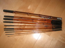 竿は、淡竹、黒竹、矢竹、熊笹を材料に作成した二間四尺から三間位の長さの10本継ぎの中通しの竿。沼津での三大竿師 高田、 竿茂 、竿正、と言った竿師がいたそうです。