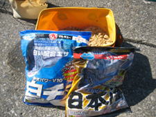 エサは、基本、さなぎの粒を使用し、撒きえさには、さなぎのミンチを赤土に混ぜてダンゴにします。