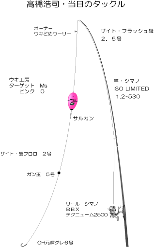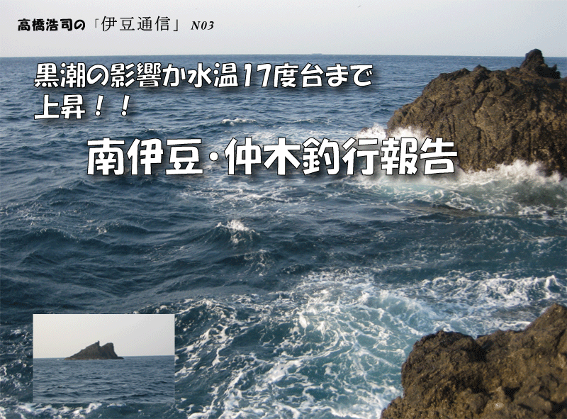 南伊豆 仲木へ釣行致しました 西風が止んだと思いきや、東の風がビュンビュンの予報でしたが、黒潮の影響か水温17度台まで 上昇!!魚の活性も良くなると思い南伊豆、仲木へ釣行しました 予想通り、東の風が強く、風裏になる釣り場が良いと思ったが、岡牛根に挑戦しました 。 岡牛根、大通し側に釣り座を構え、コマセを撒くが小魚が浮いてこない??水温が上昇しているのにと 思いつつ、仕掛けの準備。海の状況を見て、潮が岡牛根の際をかすめ沖牛根の方に流れ、サラシと 反転流の際をポイントと考え棚を5m位から少しずつ沈めようと、Target Msをチョイスハリスに、調整用のジンタンを取り付け、いざ釣り開始。 磯際から仕掛けを流し、反転流の手前に仕掛けが入ると仕掛けがなじみ、少しずつウキが沈んで行き、そのような事を4〜5回位続けると、ウキを消しこむあたり!!何とか本命をゲツトしたが、風が強くなり釣り座を移動。風裏となる岡牛根沖向かいに釣り座を構えました。 激流の下り潮!!・・・仕掛けが落ち着かないので、ハリスを短くし、ウキを沈める釣りに変更、沖に仕掛けが行くほど流れは強くなるので、磯際を集中的に攻めていると、エサが無い、もしくは半分ない状態が続き、ようやくウキがシブシブと沈み消しこみました。本命ゲットです。 |