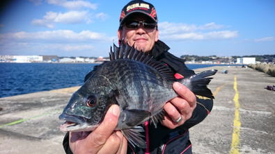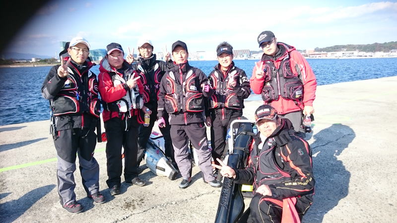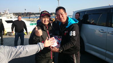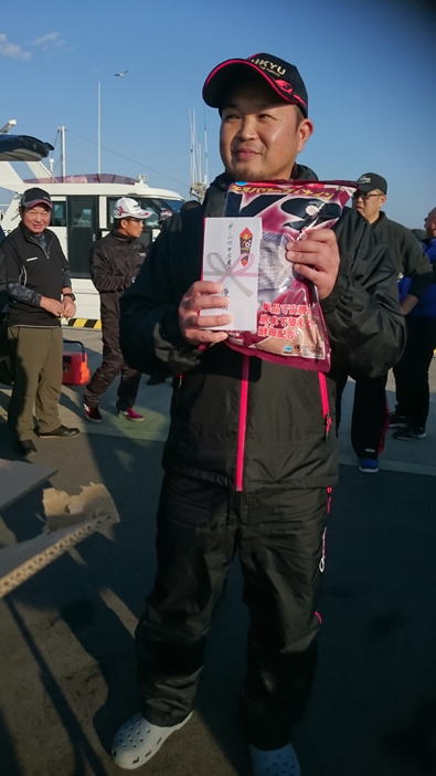 11月5日に茨城支部メンバーで小名浜港の沖堤防にて例会を開催しました! 当日は天候には恵まれましたが 皆様、年末も近いせいもあってか多忙です。 私自身も仕事が忙しく4週間ぶりの休日でしたが参加人数はオブザーバーを含めて15名とチョッピリ寂しい人数でしたが 例会は大変盛り上がりました! 今回の沖堤防への渡船は小國丸さんにお願いして 第一西堤防の 大大西の7番に6名 外側にテトラブロックが入っている大西の13番には私を含めて9名とに分かれて釣りをスタートしました。 13番に渡船する釣り人はほとんどの方が伊勢エビ狙いです。 朝のうちは予想通り フグだらけで付け餌がなかなか通りません やはりテトラ帯はフグが多い! 7番では ほとんど餌取りも無く 8時頃には益子くんや村山くんに黒鯛、メジナ狙いの岡里くんもキーパーサイズを多数との情報が! しか〜し、お昼近くに13番でも私の左隣で竿を出していた上野くんがカイズをゲット。 そして帰港してからの検量は! 釣果のあった方は7名 優勝 益子 佳久 1,665グラム 2位 村山 誠 1,230グラム 3位 岡里 直昭 1,130グラム 4位 入江 茂男 1,075グラム 5位 上野 謙次 1,005グラム 6位 金澤 良信 895 グラム 7位 野口 和博 880 グラム 以上の結果になりました。 優勝した益子くんには賞金と〜 参加して頂いたメンバー皆様、ありがとうございました。 久しぶりにメンバーの方々と楽しく釣りが出来たし、