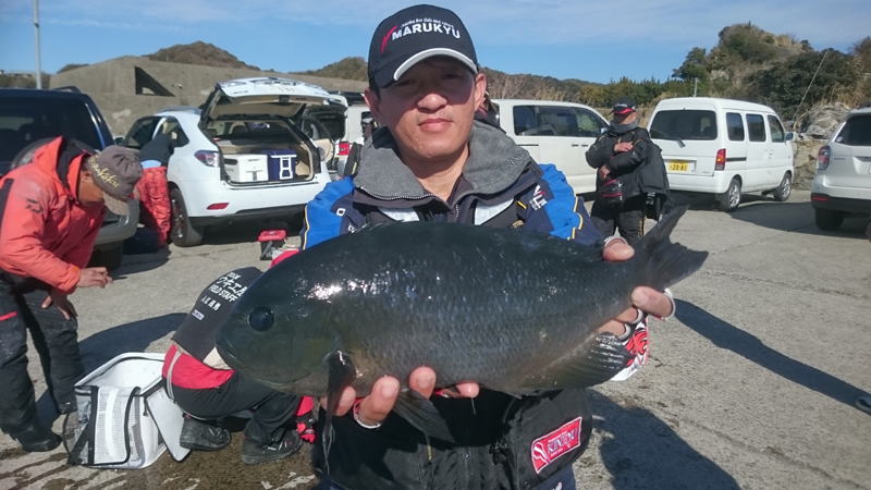 その状況でも 岡里くんが朝イチに47センチのメジナをゲット!