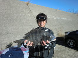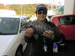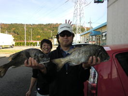すでに斎藤夫婦が根がかりバリバリさせながら釣っていました。カイズクラスがポツポツにメジナが少々。投げ釣り師の方々に御挨拶しながら釣り座ゲット。ここは晩秋には好実績のワタクシのイチ押しポイント。エサ取りもさほど気にならず、釣れる気配ムンムン。時間の経過と共にさらに気配?ムンムン?。久美ちゃんとバカ亭主はメジナやサヨリを釣ってニコニコ?ラブラブ?。 (クロダイは絶対にいる)そう確信した瞬間。「キタァー!」エロダンディの竿がバリバリ曲がっています。久しぶりの引きを存分に味わってタマ入れしたのは46pの綺麗なクロダイ。次はワタクシの番だと思うけど・・。アルミエンスイM24-0でゆっくり中層を狙えばイナダ。底までゆっくり落とせばマコガレイ・・。時間はそろそろ検量。う〜ん?「まぁ、今日はこの辺にしといてやるぜ!」。検量場のえびすつり具店の戻ると、ファンタジスタ山田と竿破壊王・忠地がドヤ顔で待構えていた。何匹ものクロダイが検量され、ファンタジスタのクロダイは50p弱、2sオーバーを頭に4匹でトップ賞。竿破壊王・忠地も40pオーバーで3位。エロダンディ山岸は2位。これらの魚はワタクシの秘儀“神経締め”でサクッと活け締め。(これで美味しく食べられるぜ、有り難く思え)検量後、吉本と斎藤支部長の特性豚汁が振る舞われたが、普段料理をしない2人の調理、具材は、雑で、デカくて、乱暴な切り方。さらに鍋の中には何か?が浮いているらしい。見かねた久美ちゃんが手を差し伸べるが時すでに遅いか?