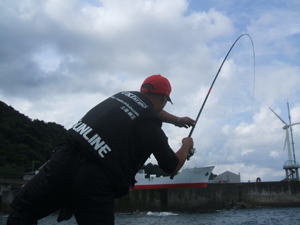 磯の周りには、程良くサラシも出ており雰囲気は良さそう。コマセをサラシの中に入れ様子を見ると、その先にフグとアジがチラチラ見える程度。この季節にフグの大群がいない?ハリス3m、遊動幅50pの仕掛けでオキアミを振り込んでみるが、さすがにオキアミではもたない。ネリックスに替えると底付近までエサがもつようだ。沈み根手前に振り込み、道糸を張りながらゆっくり落とすと、一旦止まったウキが勢いよく入っていく。元気でパワフルな引きを楽しみながら取り込んだクロダイは、この季節としては上出来の47p。開始20分と幸先がいい。それまで菓子パンをパクパク、コーヒーをゴクゴク、タバコをプカプカやっていた山岸さんもやっと気合いが入る。ウロウロしていたコイツを釣ってしまったせいか突然フグの猛攻。ハリを連続10回取られたところでしばし休憩。根際をタイトに攻めていた山岸さんはウキ取りパラソルの出番。パラソルを投げまくる山岸さんの横でエギを投げると、一発で小型のアオリイカゲット。山岸さんもウキを無事回収したし、エギにも飽きた。ウキ釣りを再開したが相変わらずフグの大群。あっちこっち投げまくりエサの残る場所を探ると、沈み根の沖側でエサが残る。初回と同じ様にゆっくりと落とすと竿先まで来るアタリ。チョッとサイズダウンだが嬉しい2匹目。その後タナをチョッと下げて同サイズを取り込みワタクシ早くも満足の終了。後ろから山岸さんの釣りを拝見していると、真剣に狙っている山岸さんは気づいていないが、付けエサを取る時にお尻の谷間がチラッと見えている。磯パンもいよいよローライズかぁ?「山ちゃ、谷間が見えてるよ」お尻の話で盛り上がると、以前我々の前にセクシーなお尻を披露してくれた、佐渡の近藤有朋さんの事を山岸さん「ローライズ師匠」と呼び大笑い。文字数の絡み?でここでは「師匠」の話は割愛させて頂くが、興味のある方は山岸さんに訊いて頂きたい。その後は山岸さんダラける一方。「アユと違ってクロダイは釣れる気がしねぇ。」「明日はイカ釣りだな」とブツブツ言いながら終了。こんな彼の奥様はとても美人で明るく、釣りへの理解も深い。その素敵な奥様に、どの様にして彼に釣りあげられてしまったのか、今度じっくり聴いてみたい。