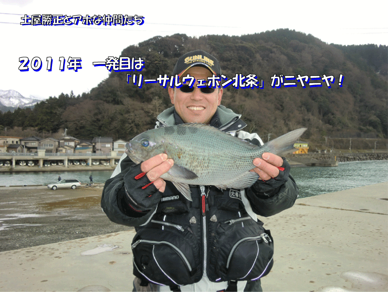 新年明けましておめでとうございます。本年も長野支部はチヌ、グレ、マダイ、ヒラメにシロギス、鮎etcとほどほどに頑張りますので皆々様、なにとぞ宜しくお願い申し上げます。2011年一発目の「アホの仲間達」は新年初釣りです。ワタクシ、昨年の大晦日は家族と「紅白」も見た。ご近所のお寺さんで除夜の鐘も突いた。1日、2日と奥様の買い物にも付き合った。そろそろ釣りに行っても良いだろうと1月3日いつもの「えびすつり具店」さんに立ち寄ると、ファンタジスタ山田が待構え、新年の挨拶もそこそこに釣り場決めをしていると、長野支部のリーサルウェポン北条浩平が釣友の寺島さんと登場。
