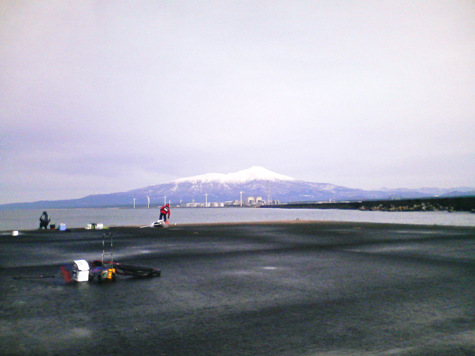 | 山形県・酒田新離岸堤の出来事! 95センチの鼻曲がり、ポーズは一度やって見たかった<西村持ち> この時期にしては珍しく中腹までしか雪の無い、出羽富士「鳥海山」 わざわざメールで送ってくれた菊地家のチャンチャン焼き |