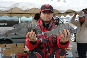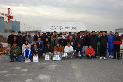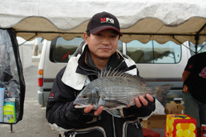 去る11月26日〈日〉大洗沖堤防にてウキ工房茨城支部の例会兼、一般クラ ブ参加(総勢56名)を含めたプチ大会を開催した! 荒天続きの日で開催できるか心配されたが、当日は日頃の行いが良かった のか海は凪で濁りもグッドのクロダイ日和…当然釣り人側もクロダイマンシ ョンとなるテトラ帯にそれぞれ釣り座を構えテトラの中からクロダイを引きず りだす作戦!…と、そこまでは良かったのだが結果はそう甘くはなかった…。 海水温は17度強と海の中はエサ取りだらけ…そいつの正体はにっくきクサ フグである!・・・ 濁りでどれ程居るのか確認はできないがポイントによっては練りエサも持た ないしハリスはガチガチ・・・そして針すら戻ってこない始末…。 手を替え品を替え試行錯誤するが状況は変わらずだったがその結果、ひた すら手返しを繰り返した参加者が見事クロダイをゲット!! 数・型とも満足いくものではなかったが 赤字覚悟の豪華商品で入賞者・お 楽しみ抽選会で大会は盛り上がり無事開催することができた! ちなみにクロダイの大会にもかかわらずエビ工房テスター?・・・の国井氏 は茨城のテトラの穴から伊勢海老を二匹引きずり出し、優勝したかの様で あった事を付け加えておこう! 1位 ウキ工房茨城支部 入江茂男さん