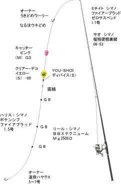 | 全国のクロダイ釣りファンが頂点を目指すべく参加し、全国各地で予選会が 繰り広げられる『シマノ・鱗海カップ』今年は、関東での予選会が中止になっ たため、山形・庄内の由良で開催される『東北予選』に参加しました。 土曜・日曜の二日間に分けて開催されるこの大会は、隔日約60名が参加 し、その上位一名づつが九月末に開催される『決勝大会』に勝ち上がれると いうもので、30センチ以上のクロダイ2匹の重量にて競われます。 私は、日曜日の予選会に参加しました。 当日、まだ薄暗い朝二時半から受付が開始され、クジ引き抽選の結果、私 は『ゼッケン番号26番』を引き当てました。ゼッケン番号の1〜20番の選手 は加茂の磯。21番以降の選手は由良の磯となります。 そのため、私は由良の磯へ一番船で渡ることになりました。 船が出船し向かった場所は『みさご島』。 以前、一度だけ真夏に渡ったことがありましたが、その時は大量のフグの 猛攻に会い『撃沈』された苦い思い出のある場所でもありました。 みさご島には3名で渡り、ゼッケン番号の若い順に釣り座を選ぶのですが 予想通り、私の場所選びは『三番目』・・・正直、その時点では今回のよう な『思いもよらない展開』になろうとは、私も、まわりのみんな誰もが予想は 付かなかったでしょう・・・予想がついていたのは『岡田さん』だけ?(^O^) それはさておき!空いている場所は、グルッと周り込んだ島の反対側。 ふくよかな体型の私にはそれだけでも『地獄』。その苦労を乗り越え、重い 荷物を持ち、えっちらこっちら歩いてやっと釣り座を確保して釣りを開始しま した。競技時間は、磯に上がってからの『七時間』と決まっているのです。 早々、汗だくになったのでレインウェアーを脱ぎ捨て『戦闘開始!』 左側には『みさごのハナレ』があるこの釣り座は、ハナレとの水道の出口に なる場所で、潮は左から右に流れ、右の切り立った磯際からは払い出しが 作られ、クロダイが釣れるであろうポイントは一目瞭然でした。 しかし、水道というせばまった地形の関係で潮の流れが強くなる場所でも あるのです。 それを考慮し、足元の左側にコマセを入れつつ、磯際からそのポイントまで を探ることにしました。使用したコマセはオキアミ9キロに対し、マルキュー の新製品『チヌパワーダッシュ』×2袋+『メガミックスチヌ』×1袋。私が今、 一番信頼を寄せている配合パターンです。仕掛けのほうも、水深のある釣り 場・潮が流れる釣り場だったことを考慮し、キャッチーG3ピンクを上ウキに 使用し、clearー凸のSー00クリアーイエローの2段ウキ仕掛けをチョイスし ました。始めは、ガン玉を打たない仕掛けで釣っていましたが、潮の流れが 思ったより早いため仕掛けを立たせようとハリスに8号のガン玉を三つ、段 打ちしました。ガン玉を打って仕掛けが安定したので、その仕掛けで探って いたその時、早く流れていた潮も緩み始めました。仕掛けも狙いのポイント に入り、コマセとも完全に同調しています。『お〜、良い感じ』と思っていたら、 上ウキのキャッチーがゆっくり水中に入っていきました。道糸を張り、竿先で アタリを聞いてみると・・・『クン、クン、グッググッ〜』と穂先が持ち込まれ、ア ワセを入れると下に突っ込むクロダイ特有の走り方、しかも良型らしく引きも 強い!慎重に時間を掛けて上がってきたのは44、5センチの大型クロダイ! 慎重にタモに納め、活かしバッカンに投入。次の2匹目を狙い同じ場所をガン 玉・仕掛け・コマセの打ち方などを変えながらしばらく狙ってみるが反応はな く・・・『もう、この周りにはクロダイはいない!』と見切りを付けて違う場所を 狙うことにしました。 しかし、試行錯誤していくもののクロダイの反応がないまま時間は過ぎ『今 年も一枚だけか!』と諦めかけたのですが、イチかバチかの『超遠投勝負!』 に賭けてみました。潮も流れ、近場も反応がないとなると『これしかない!』と 思いチャレンジ!しばらく沖目を超遠投で狙っていくと、場所によりオキアミ が残る場所と残らない場所が出てきた。その、オキアミが残る場所をコマセ の撒く量を多目にして集中的に狙っていた数投目・・・ウキが消し込み竿先 まで伝わるアタリが!一呼吸おいて合わせると『乗った!』(^O^) 待望の2匹目なので、いつもより慎重に時間をかけて寄せてくると、中型で はあるものの正真正銘のクロダイ!玉網に納めた時は、ラスト一時間前。 潮の流れもちょうど変わり、道具の片付けと磯清掃をしてから船付け場まで 帰ることにした。帰りの足取りは、間違いなく『行きより軽い』。しかし、検量 の結果次第でまだ分からないので油断は禁物!もちろん、周りの釣果が一 番気になり・・・由良の港で検量した結果2300グラム。とりあえず、由良の 磯ではトップだったが、加茂の磯の釣果が気になるまま集合場所に向かった。 最終的に、加茂の磯では48センチの大型や一人で4枚釣った人がいたみた い