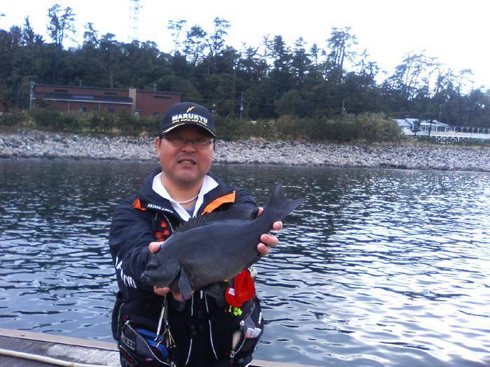 慎重に手前まで寄せタモに収めたのは40cmを有に超える良型のクチブトメジナ。そ