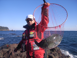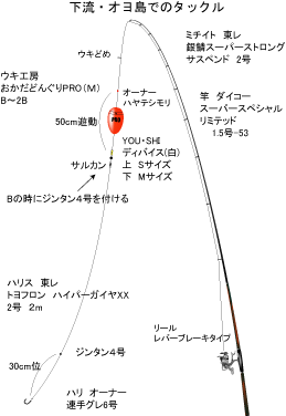 新年、明けましておめでとうございます。 2007年もたくさん釣りに行ってこの場をお借りして紹介させていただきますので宜しくお願い致します。 日本列島を強烈な低気圧が通過し、大荒れが続いた直後の10日に静岡県南伊豆の下流の沖磯へとメジナを狙いに訪れてみました。 港に到着し海を見ると波もかなり静かになってきており問題はなさそうです。 私は二人で沖平根という一番沖に位置する磯に渡礁しました。適度な波っけがありいかにも釣れそうな雰囲気に期待が高まります。水温は17、4度 釣り始めてしばらくすると西風が吹き始め波が高くなりはじめました。やはり安全が第一なので地方寄りのオヨ島という磯に移動し改めて釣り開始です。この磯はサラシもほとんど無いような状況で安全ではありますが果たしてどうか・・! 水深は3〜4メートルと浅いので深く狙うことはできません。溝や沈み根があるので集中的に狙います。問題点は取り込みであります。狭い溝や沈み根が点在する中を狙うのでヒット後には強引にメジナを寄せなければタモに収めることはできません。従って、強引に寄せることができるタックルを使用します。(図参照) この磯ではウキを沈めて狙うのは不向きなので「おかだどんぐりプロ・MサイズのB」を選択します。ハリスを2、5メートル取り遊動を50センチ程としてジンタンをハリ上30センチに付けて根際を狙いやすくします。開始早々、フグやウミタナゴがヒットしますがマキエにはこれが大群で寄っているようです。これではまずい・・とマキエは磯際付近のみに入れて少し沖目の根際を狙います。するとエサが残るようになりました。それでもマキエを磯際に入れ続けて狙うと明確なアタリがありヒット! 本命のメジナではありますが25センチ級の尾長メジナです。何匹かヒット後に遂に強烈な引きが来ました! 35センチ程の口太メジナでありますが一度、根に張り付かれてしまいました。これがもっと大きいメジナだったらバラシていたかもわかりません。次は一気に寄せなければ・・! 風が強くなってきたのでウキを2Bに変えて直結部にジンタンを追加して狙います。 ウキ下は3メートルのままで狙い続けるとウキが水中に消えました。アワセを入れると同時にリールを一気に巻きます。すごい重量感が伝わってきますがかまわずにひたすら巻いて寄せます。すると水面下にメジナの姿が確認できました。浮かしてタモに収まったのは40オーバーの良型であり嬉しい1匹です。ヒット後、竿でためてメジナを浮かせるという取り込みでは一瞬で根に張り付かれてしまうでしょう。このような状況ではアワセを入れる瞬間からが大事です。大きさを感じてからでは遅すぎます。一気にリールを巻きますので小型メジナの際は水面に飛んでくる場合もありますが・・これは仕方ありません。 乱暴なようですが私自身が今までに悔しいバラシを多発した結果の対処方なので参考にしていただければ・・と思います。 その後も二人で37〜45センチのメジナを10匹程追釣し、一日を楽しんだ下流の磯を後にしました。 これから最盛期を迎える下流の磯に是非、訪れてみてはいかがでしょうか! 西風に強いので冬の季節風が多いときには狙い目です